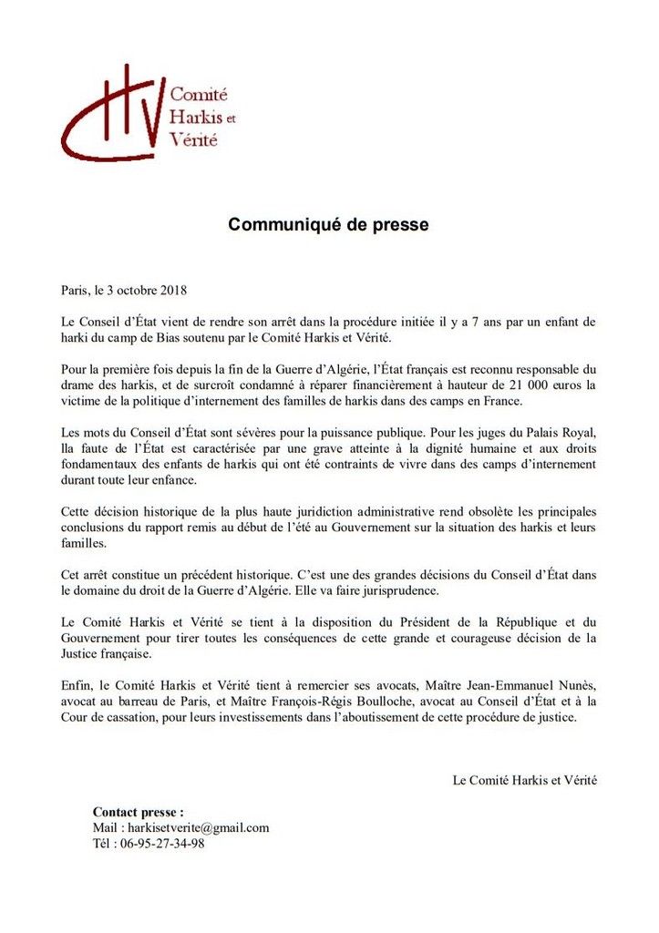 - Communiqué de presse du Comité Harkis et Vérité après l'arrêt historique du Conseil d'Etat -
