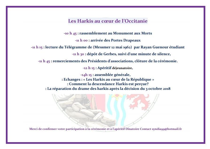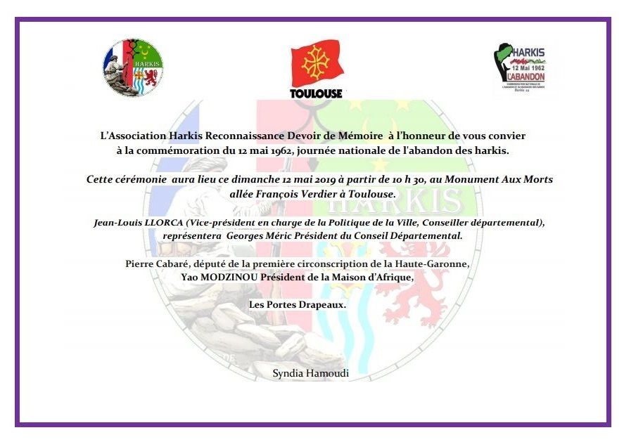 L’Association Harkis Reconnaissance Devoir de Mémoire à l’honneur de vous convier à la commémoration du 12 mai 1962, journée nationale de l'abandon des harkis.