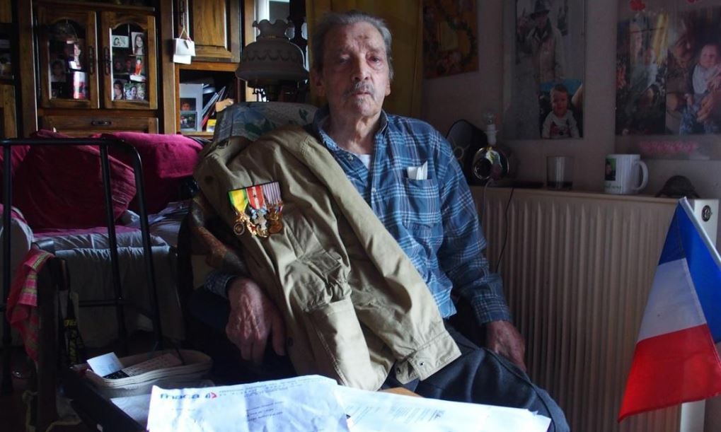 C'est là qu'il passe toutes ses journées, c'est là qu'il s'accroche à la vie, qu'il lutte contre la maladie qui le ronge. Sur une table, devant lui, un petit drapeau français flotte au-dessus des archives militaires qui racontent son histoire.