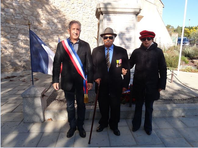 Méziane Hacène devant le monument aux Morts avec le maire et l’une de ses filles.